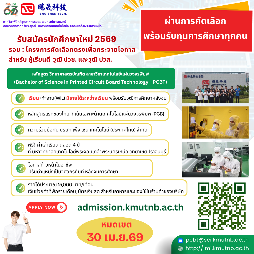 - [10 เม.ย. 69] หลักสูตรเทคโนโลยีแผ่นวงจรพิมพ์ (PCBT) เปิดรับสมัครนักศึกษาใหม่ ปีการศึกษา 2569 รอบโครงการรับตรงเพื่อกระจายโอกาส สำหรับผู้เรียนดี วุฒิ ปวช. และปวส. โดยเปิดรับสมัครตั้งแต่วันที่ 10 – 30 เมษายน 2569
