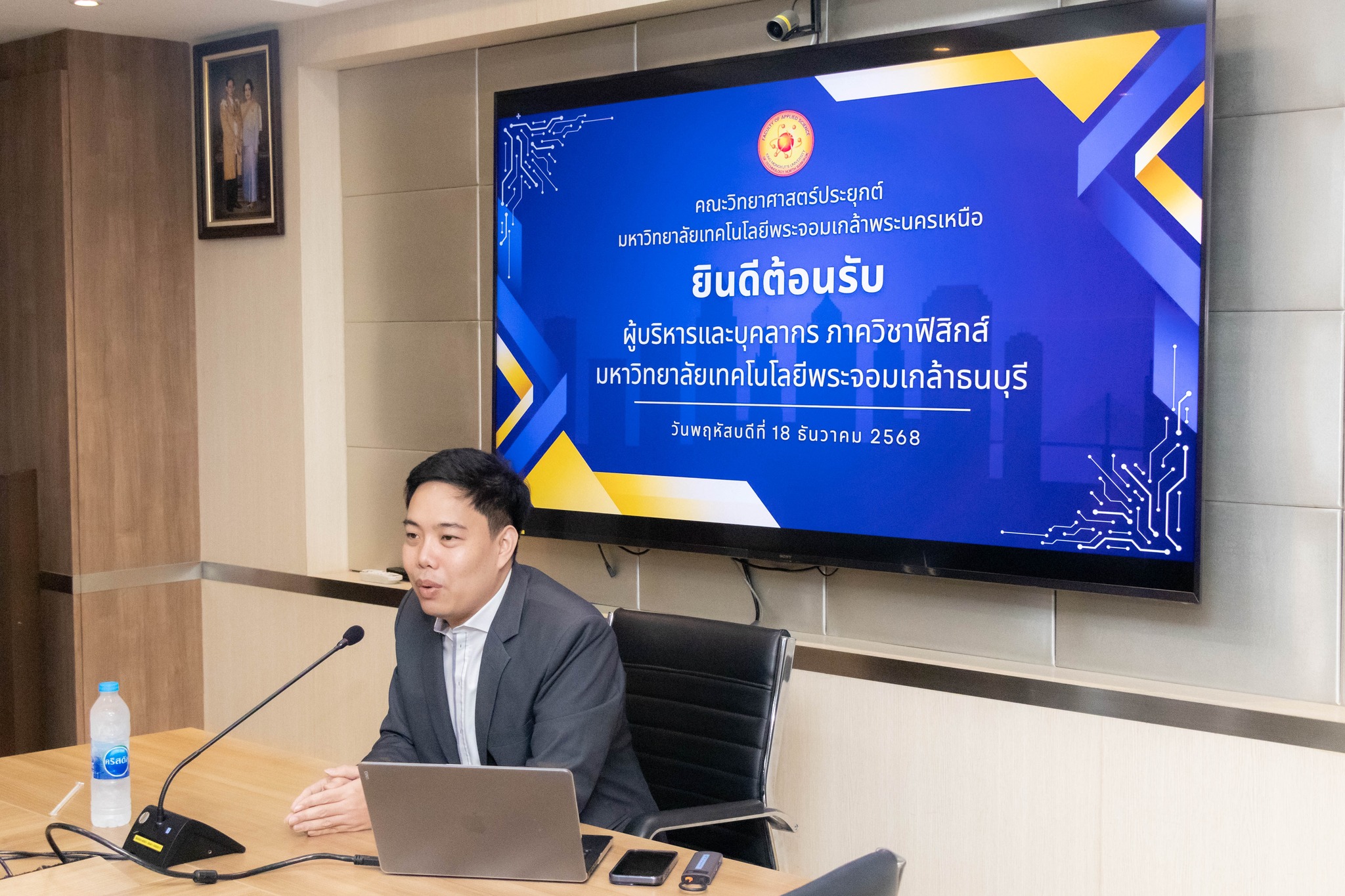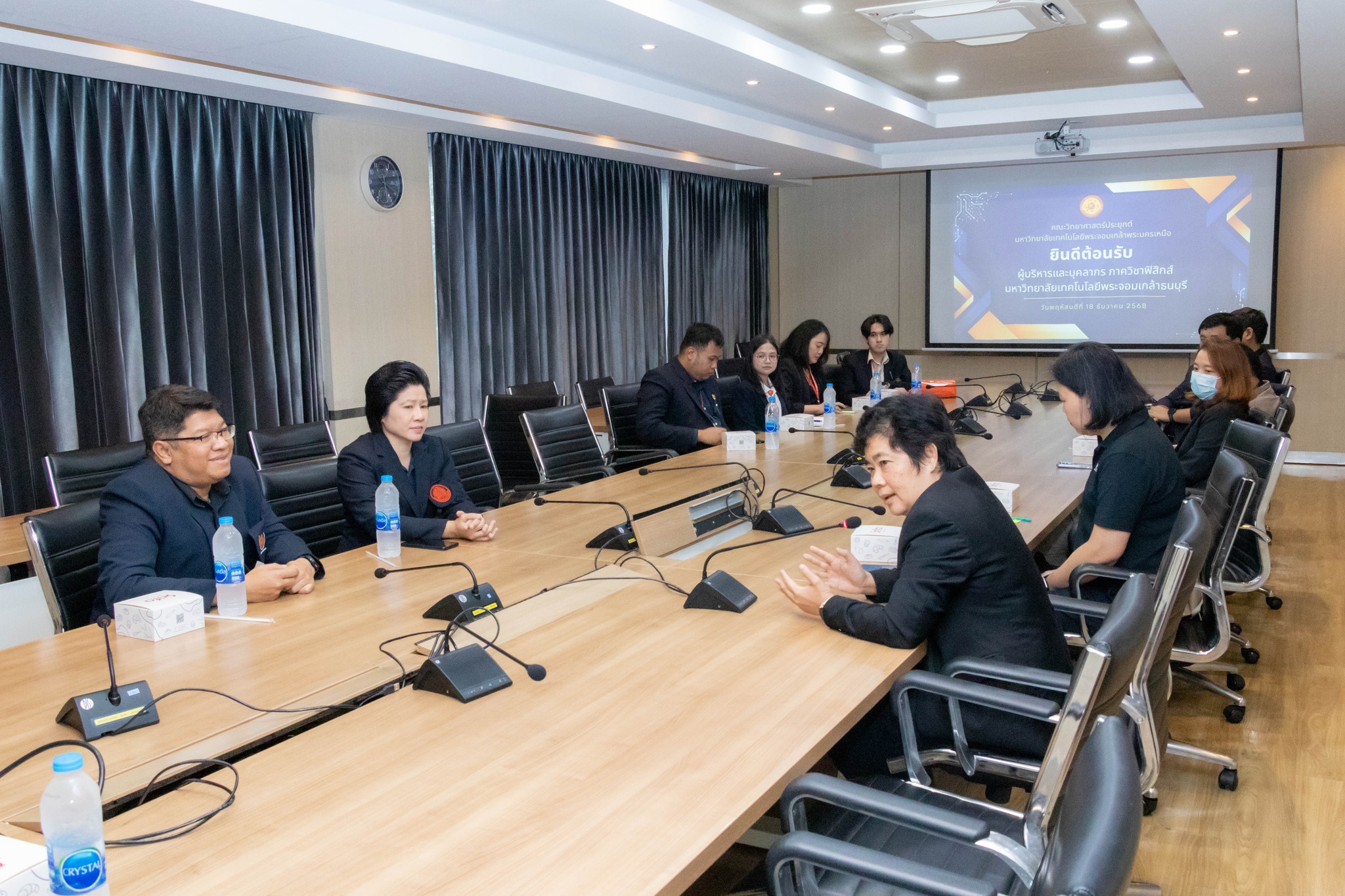 วันที่ 18 ธันวาคม 2568 ห้องประชุม 203 คณะวิทยาศาสตร์ประยุกต์ มหาวิทยาลัยเทคโนโลยีพระจอมเกล้าพระนครเหนือ (มจพ.) โดย รศ.ดร.นนชณัต ฉัตรภูติ รองคณบดีฝ่ายวิชาการ พร้อมด้วย ผศ.ดร.อนุสรา ศรีสรวล รองคณบดีฝ่ายอุตสาหกรรมสัมพันธ์และสหกิจศึกษา ผศ.ดร.เสฎฐวุฒิ ดวงจันทร์ หัวหน้าภาควิชาฟิสิกส์อุตสาหกรรมและอุปกรณ์การแพทย์ ให้การต้อนรับ ผศ.ดร.วันดี อ่อนเรียบร้อย หัวหน้าภาควิชาฟิสิกส์ คณะวิทยาศาสตร์ มหาวิทยาลัยเทคโนโลยีพระจอมเกล้าธนบุรี (มจธ.) และคณะบุคลากร เข้าประชุมหารือเรื่องการบริหารจัดการหลักสูตรโดยเฉพาะด้านฟิสิกส์อุตสาหกรรม อุปกรณ์การแพทย์ และฟิสิกส์ประยุกต์