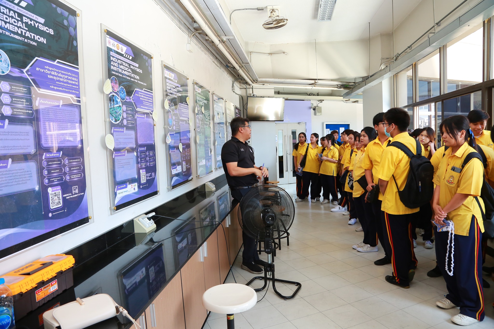 โอกาสนี้ คณะครูและนักเรียนได้เข้าเยี่ยมชมภาควิชาฟิสิกส์อุตสาหกรรมและอุปกรณ์แพทย์ โดยมีผู้บริหารและคณาจารย์ของภาควิชาให้การต้อนรับ พร้อมทั้งแนะนำการจัดการเรียนการสอน เครื่องมือ อุปกรณ์ และห้องปฏิบัติการที่ใช้ในการศึกษาและการวิจัย ทั้งนี้คณะผู้เข้าศึกษาดูงานยังได้เยี่ยมชม ห้องนวัตกรรม ห้องปฏิบัติการอุปกรณ์การแพทย์ ห้องปฏิบัติการอิเล็กทรอนิกส์ และศูนย์ KMUTNB National Semiconductor Training Center ชั้น 1 เพื่อเรียนรู้เทคโนโลยี เครื่องมือ และกระบวนการปฏิบัติงานจริงที่ใช้ในการเรียนการสอนและการวิจัยของภาควิชา